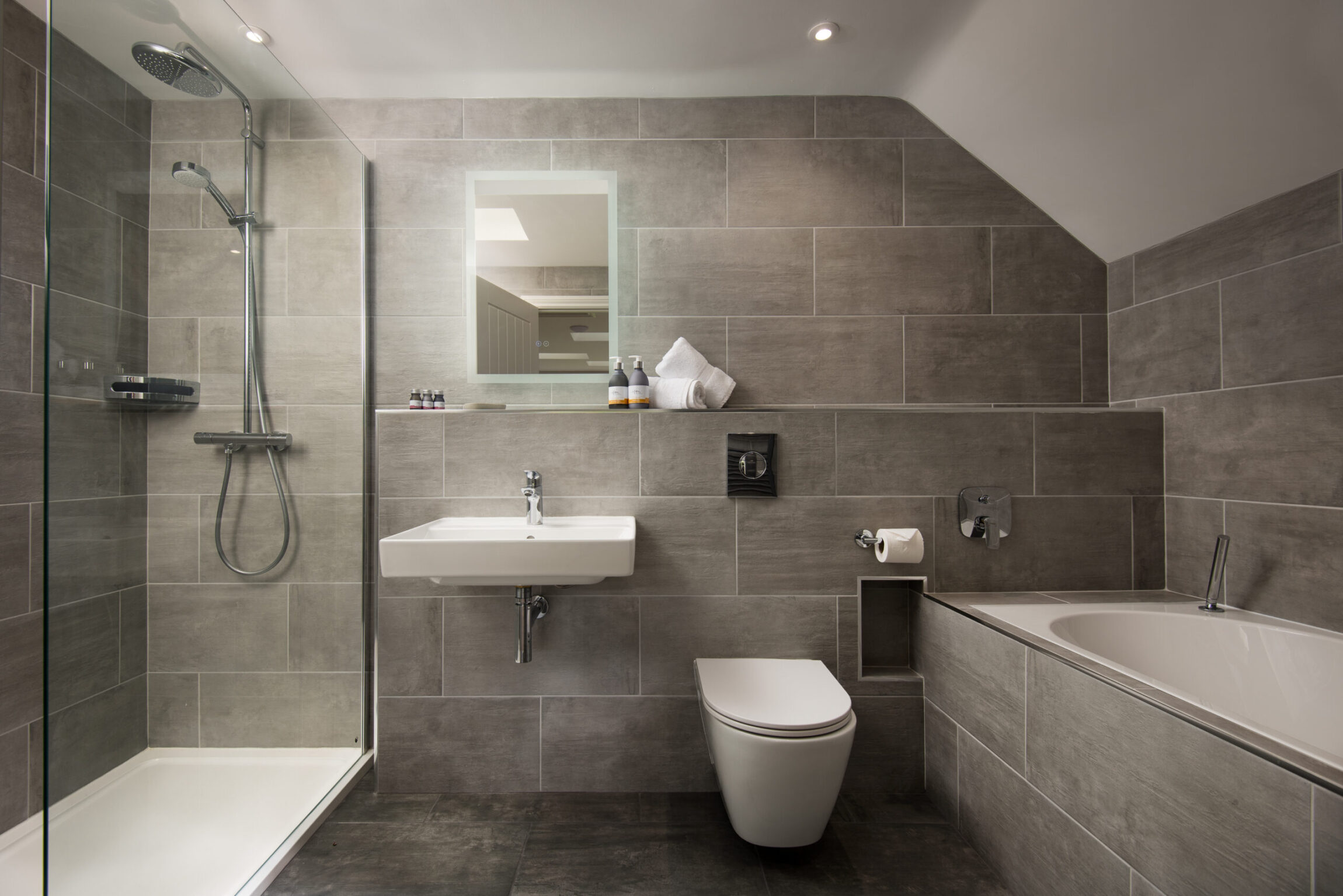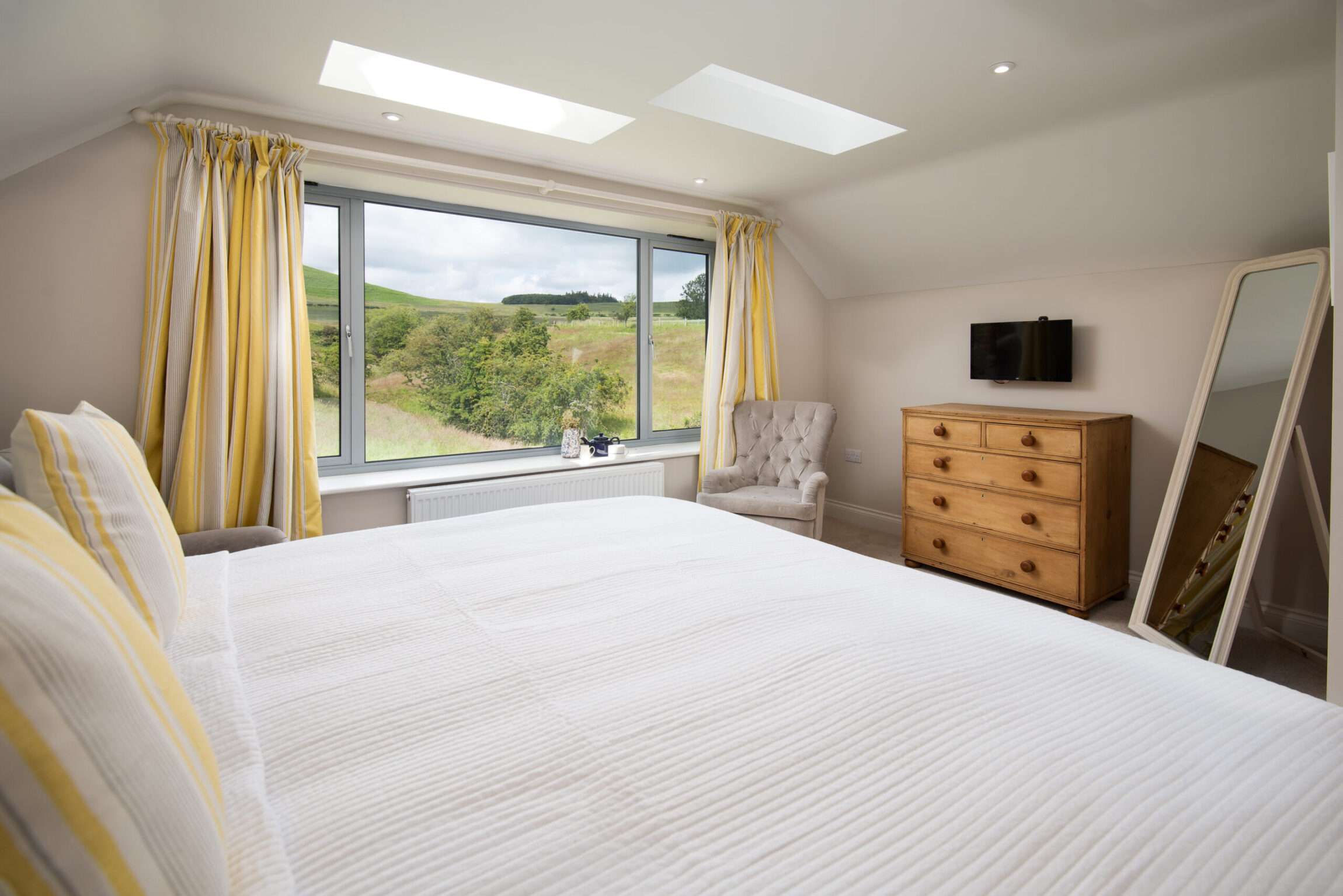 Upstairs, Lucy has a generously-sized bedroom that can be made up as a double or twin. A large window boasts arresting countryside views, so you can fall asleep staring at the stars and wake up bathing in sunshine. The fully-tiled ensuite has both a bath and shower.